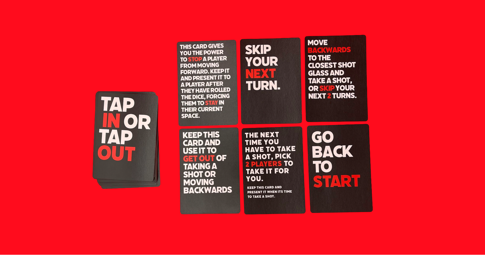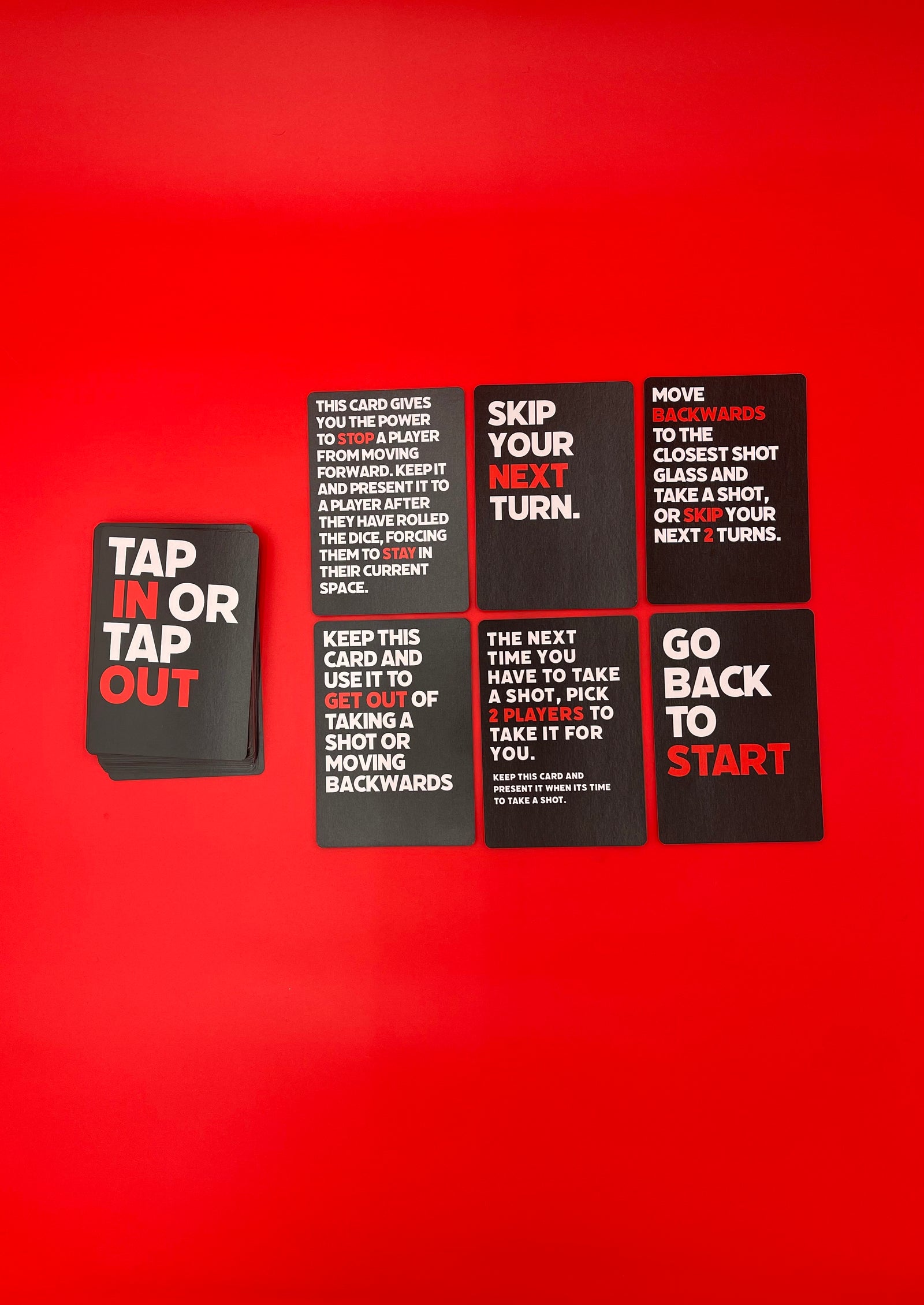 Players will roll the dice and move through the maze towards the finish line! Some players will have to take a shot, and some will have to draw a card. Some spaces on the board will allow you to move forward or force you to go backwards. Either way, PREPARE YOURSELF. If you can get to the finish line sober you ought to go play the lottery!